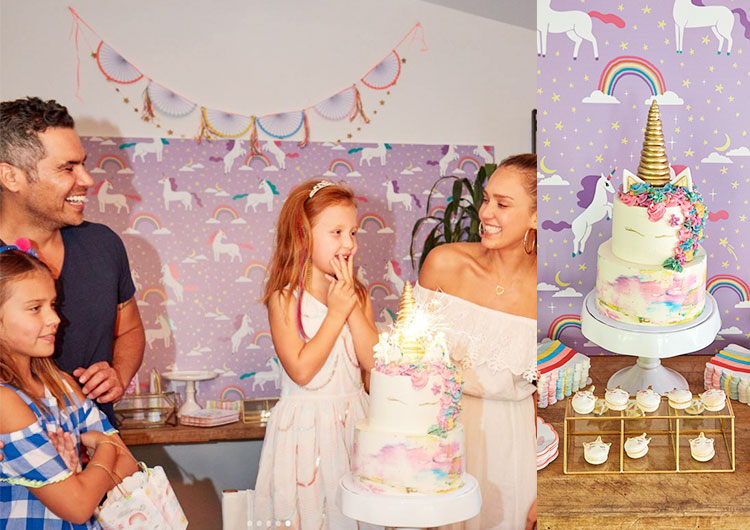 Еще одна вечеринка с радугой и единорогами, уже для 7-летней дочери Джессики Альбы – Хэвен. Журналу People Джессика рассказала, что один из ее любимых моментов родительства – организовывать вечеринки для детей, которые они запомнят навсегда. А еще призналась, что на праздник в стиле unicorn ее семью вдохновил тематический паттерн, который Джессика с командой придумала для оформления средств ее бренда The Honest Company. Малышка Хэвен была счастлива, задувая свечи на огромном трехъярусном торте.