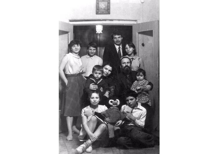 Слева направо (начиная с заднего ряда): Лидия, Никита, Андрей, Елена, Михаил на руках у мамы, Анна на руках у папы, Мария, Николай